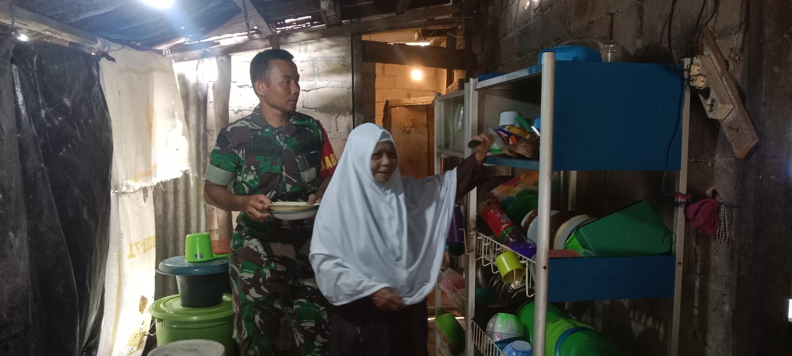 BANGKA BARAT — Babinsa Koramil 431-02/Mentok Desa Simpang Tiga, Sertu Sabariyanto beranjangsana ke dapur milik warga, yang biasa disapa Ibu Sarnah (70) warga Desa Simpang Tiga Kecamatan Simpang Teritip, Kabupaten Bangka Barat, Miinggu, (30/07/2023).