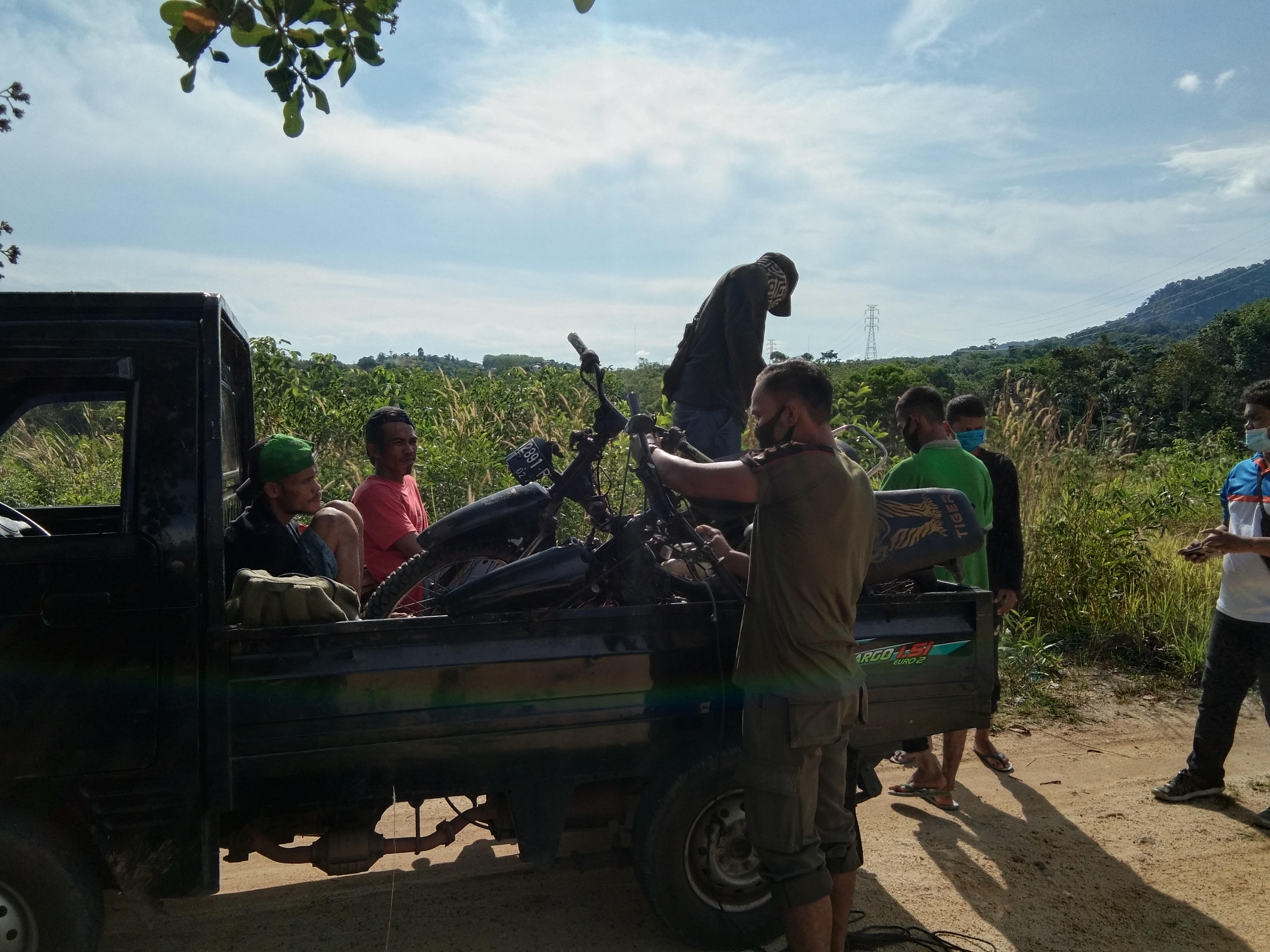 Pantauan portaldutaradio.com di Kampung Sinar Menumbing, Desa Air Belo, tempat dua penambang diamankan sementara, Ringga dan Purwanto serta barang bukti dinaikkan ke mobil pick up. Kedua tangan mereka diborgol. Terlihat dua unit sepeda motor dan beberapa gulung selang dan barang bukti lainnya juga diamankan.