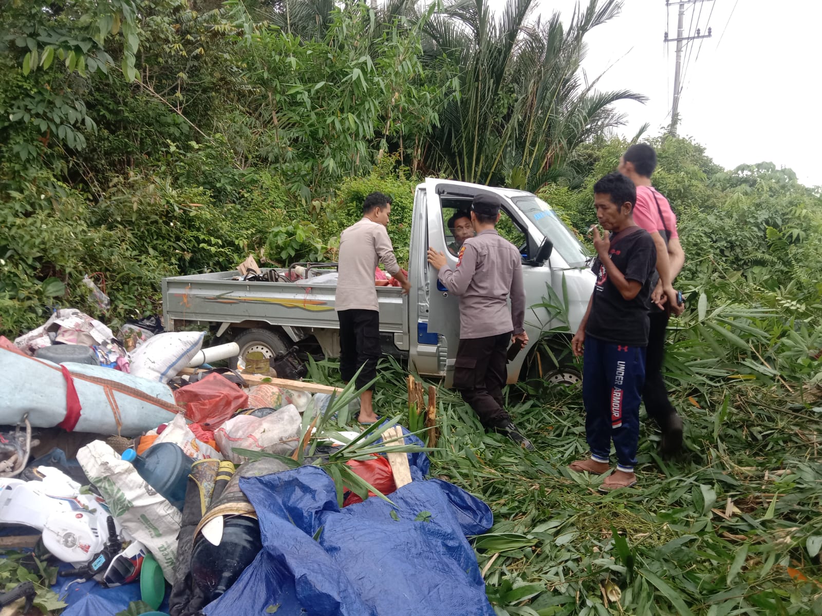 Anggota Polsek Kelapa turun ke TKP untuk mengevakuasi mobil tersebut beserta muatannya yang berhamburan di semak – semak.