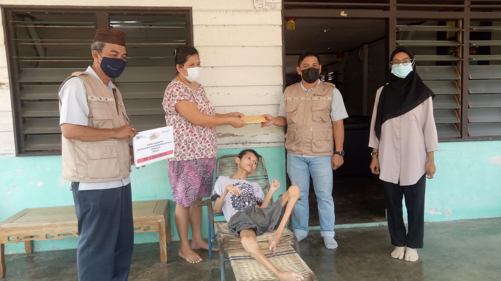 Bantuan tersebut diserahkan langsung oleh Manajer Pada Project Ausmelt PT. Timah, Abang Asriyadi kepada Salbiah, ibunda Kevin.