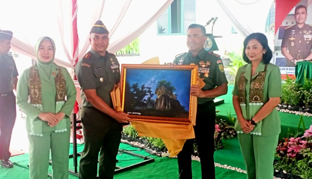 Pada akhir acara dengan penuh rasa kekeluargaan, Dandim 0432/Bangka Selatan Letkol Inf Gani Rachman dan istri memberikan cinderamata kepada Dandim 045/Gaya Brigjen TNI Agustinus Dedy Prasetyo. (Suf)