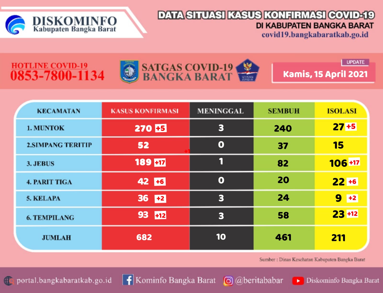 Update kasus Covid – 19 Bangka Barat per Kamis, 15 April 2021, total 682 dengan rincian 211 diisolasi, 461 sembuh dan 10 meninggal dunia. ( SK ).