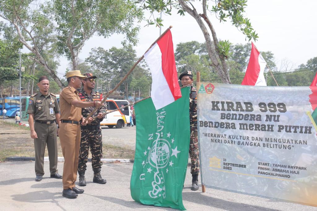 PANGKALPINANG — Penjabat Gubernur Kepulauan Bangka Belitung Suganda Pandapotan Pasaribu, melepas peserta Kirab Bendera Merah Putih dan Nahdatul Ulama di Bhaypark Polda Kepulauan Babel, Senin (11/9/2023).