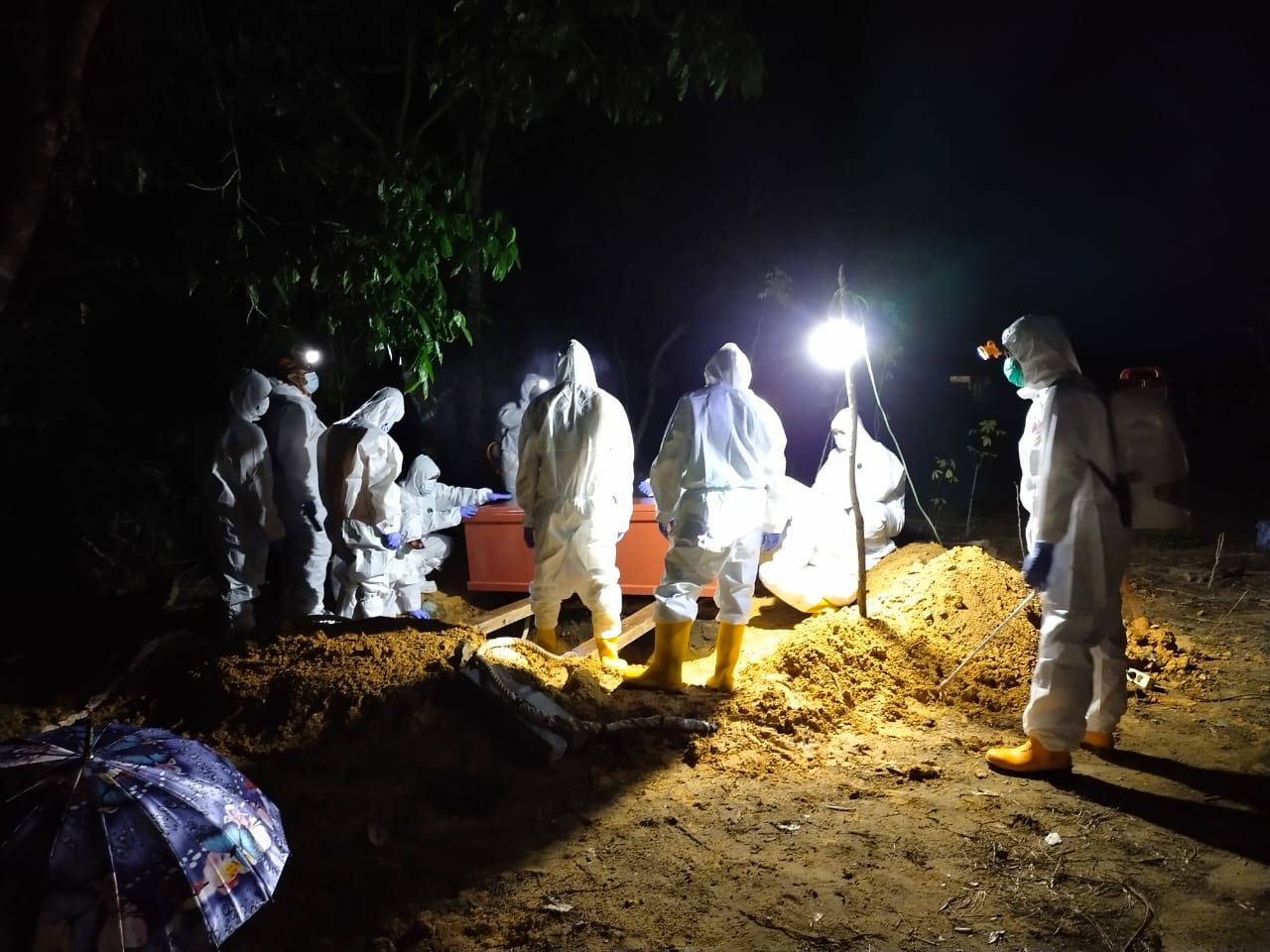 ” Almarhum terkonfirmasi Covid – 19 dari pemeriksaan PCR tanggal 9 Juli 2021 dan dimakamkan secara protokol kesehatan di TPU Kebon Nanas, Kelurahan Sungai Daeng,” jelas Putra.