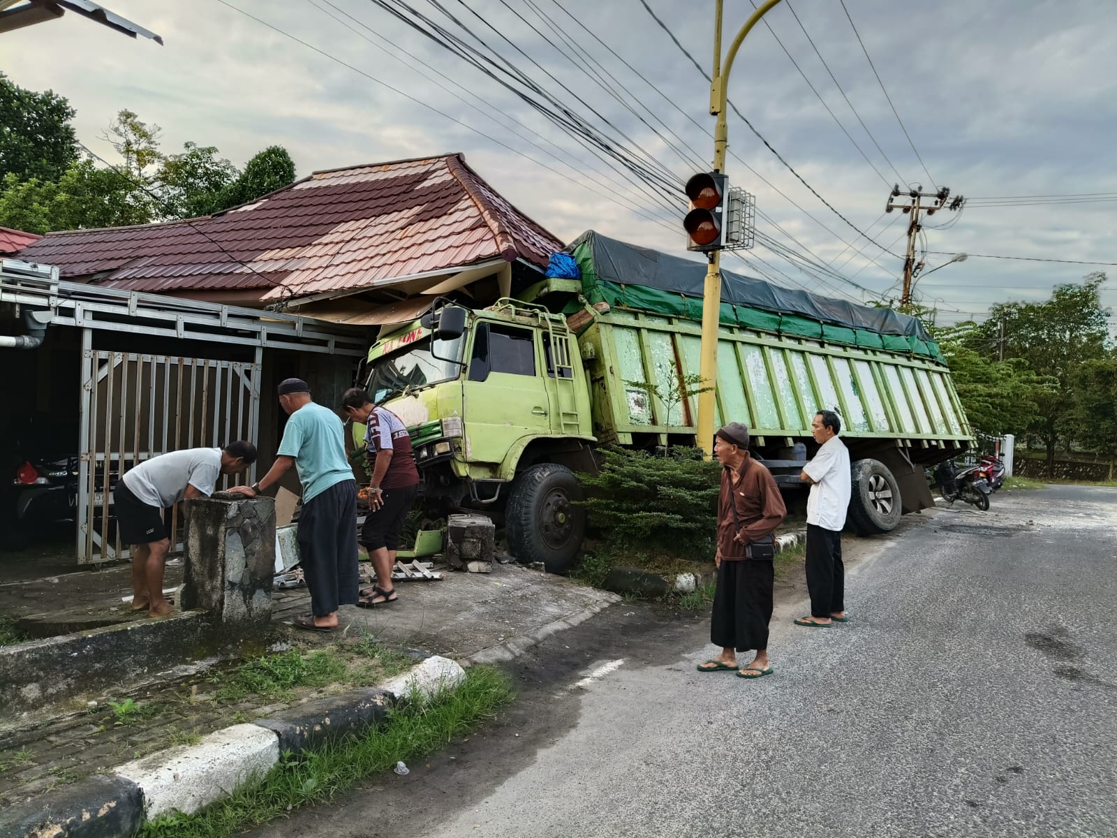 Sebuah truk Fuso berwarna hijau menabrak rumah milik Puspa warga Jalan Imam Bonjol, Kampung Keranggan, hingga teras depannya porak poranda. Bagian depan truk tersebut masuk ke teras, sementara bagian belakangnya berada di atas trotoar jalan.